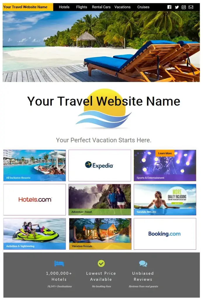 Your SEO-optimized travel website features top travel brands, is fully responsive, socially connected and displays your business information.